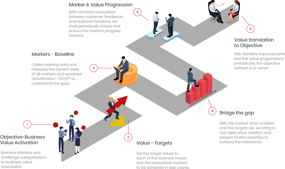 In our framework, our customer channels and engagements along with organization workforce and operational efficiency derive the best business values - Margins, Velocity, and Experience. With continuous progressive assessments, we help you take